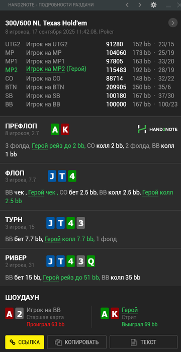 Передо мной всплывет цепочка выводов по споту, которая, возможно, приведет меня к росту понимания, как играть в тех или иных ситуациях, уже каким-то новым идеям и выводам, как вы понимаете, здесь все зависит только от вас самих и выводов, которые вы делали по отдельным раздачам и спотам раньше).