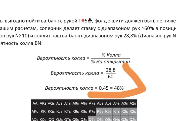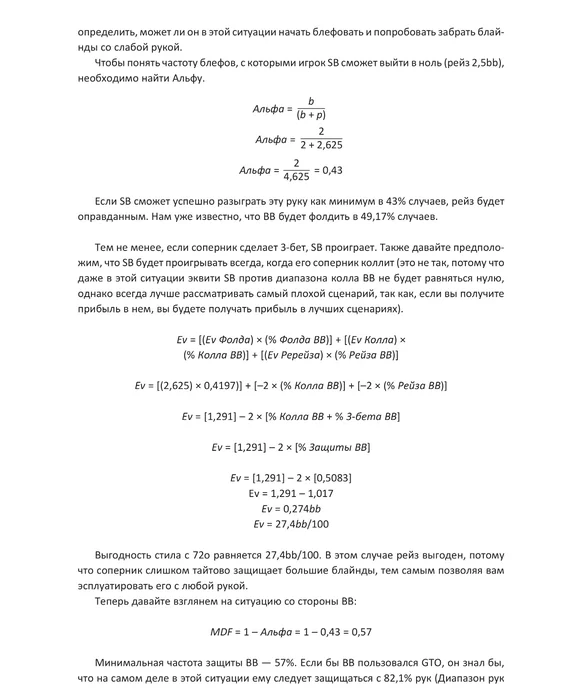 Вообще, многие формулы скорее всего и не применимы в игре. К примеру, чтобы вычислить EV конкретного действия нужно знать eq диапазонов, а Эквити (eq) диапазонов вычислить скорее всего не представляется возможным, т к в книге и формулы даже такой пока не нашел, Эквити можно только запомнить. Но уж проще тогда запомнить ev чем eq.