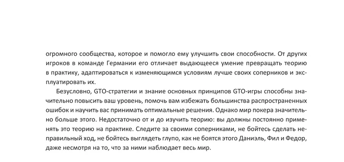 много математики и сложных формул; для человека не являющегося математиком это всё прям тяжело воспринимается; здесь можно одну-две страницы подолгу изучать, пытаясь вникнуть и понять - а всего в книге их 478. Крч, читать, листая страницы одна за другой, вот прям вообще не получится (Однако, стоит отметить, что в начале книги приведены основы, помогающие новичкам вникнуть в терминологию покера и понять написанные далее слова).