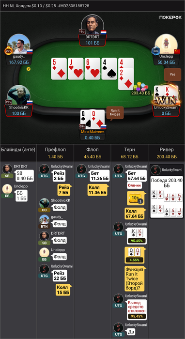 Shootnick88, ну да, с учетом того что он не агрессивный это все-таки пас. Но мне кажется что я не только АК червей бью. Все-таки в диапазоне 4-бета должны быть иногда АКо AQ, я думаю что у него на терне должны быть пуши еще с этими руками с А червей в руке. Тут все равно моя ошибка, 6 таких комб вряд ли набрать