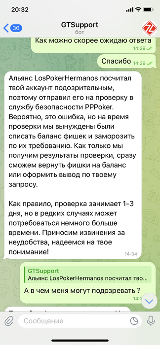 Ну хорошо 👌🏼жду 1-3 дня, аккаунту отроду 2 недели, проверять по сути нечего, но на всякий случай написал на официальную почту PPPoker и попросил проверить мой аккаунт на честность , на что получил ответ в течении 8-12 часов 🧐