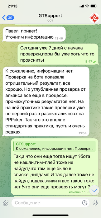 Написал сегодня в службу безопасности Gt,на что мне ответили,что после срока отведенного на проверку службы безопасности союза LosPokerHermanos в 21 день(они сами инициировали такой большой срок проверки )в случае если нарушений не будет выявленно,мне выплатят всю сумму 1825 usd!!!