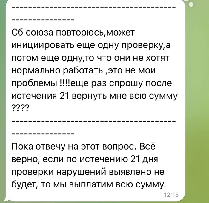 для этого мы уже определись,что спустя 21 день,если союз не выявит нарушения,а он их не выявит !вы выплачиваете мне всю сумму.