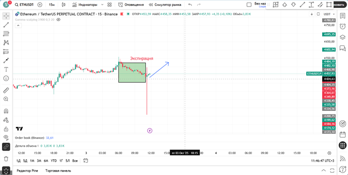 Не спел до экспирации заскринить картинку с max pain для маркетмейкера, но на ней для опционов ближайшей экспирации был страйк 4350. И маркетос за 8-10 часов до экспирации начал давить цену как можно ближе к этому страйку