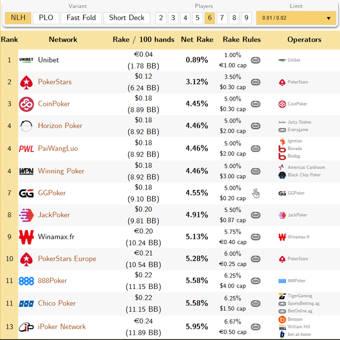 Ну и на счет Чико согласен с товарищем TheHateMachine , но хотел бы только еще добавить, что там один из самых высоких показателей рейка , а вот рейкбек вроде вообще чуть ли не отсутствует насколько помню . Рейк кст можно глянуть на том же сайте , что я указал выше. Сам я когда начинал играть то стартанул с нл2 на Айпокере а там рейк на микро был еще выше, и сейчас глядя в прошлое ,самому себе бы я тогда посоветовал в первую очередь выбрать рум с рейковой нагрузкой пониже и селектить как можно лучше . Тогда мой рост был бы быстрее, но к сожалению мне тогда не от кого было это услышать🙃