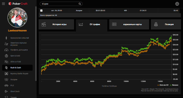 LawlessHeaven, отыграл 15к рук на нл 2, по результатам чистый выигрыш за столами +24,03$, лидерборды +3,7$, рейкбек +0.59$, пока оранжевая и зеленая линии идут ровно отчасти из-за того, что при выставлениях соглашаюсь крутить по 2-3 раза