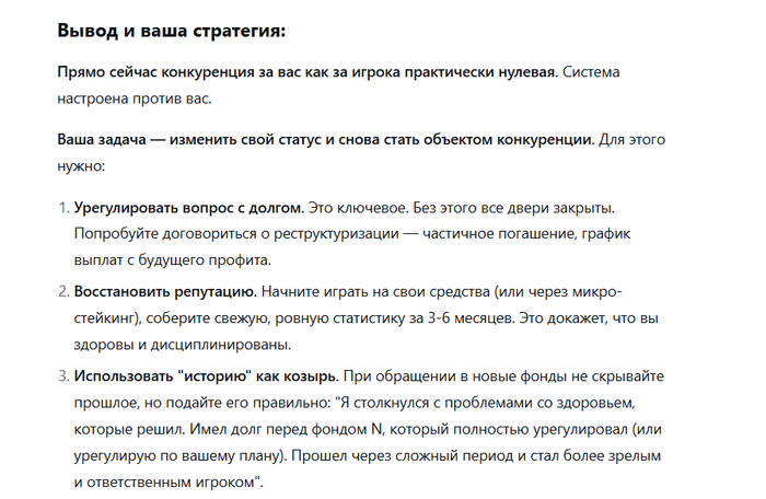 вот моя сторона истории. хочу от всего этого расклада я вот что - чтобы мне открыли дорогу в покерные фонды. если нет, то за мои действия, обозначенные как воровство, парнем, который не факт что в деньгах нуждается и идёт чисто на принцип, пойдёт волна. причём конкретная.