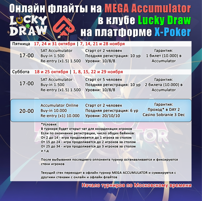 В первую очередь хотим обратить ваше внимание на флайты турнира Mega Accumulator, которые будут проходить каждый день в 22:00 стоимостью 10к рублей.