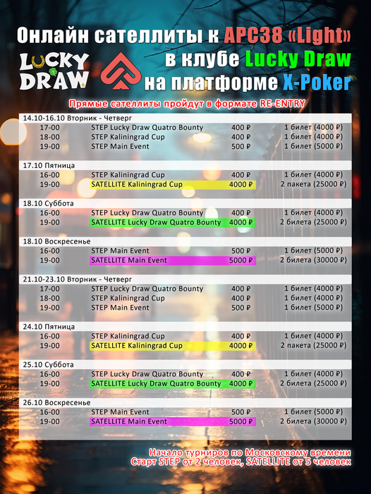 - 22:00 МСК (21:00 по Калининграду) степы к финальным сателлитам к следующим турнирам APC-38: