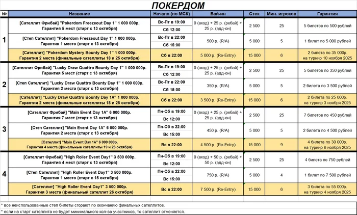 - С 18 октября стартуют флайты стоимостью участия 10к рублей, стартовый стек 10.000 фишек, играются до 10% оставшихся участников. Формат Re-Entry.