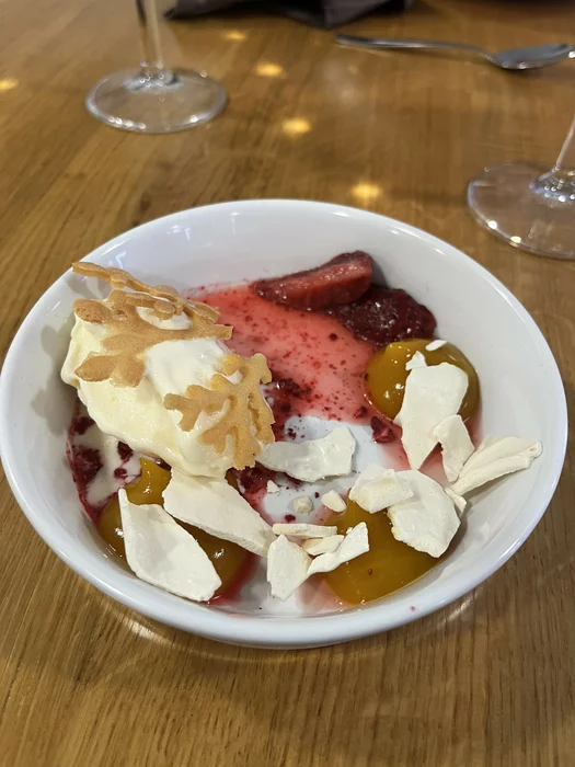 3. Мороженое с чипсами бингрэ, клубничка, персик и корочки от бри (или камамбера).