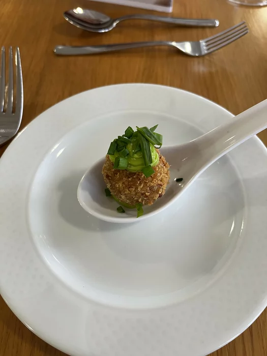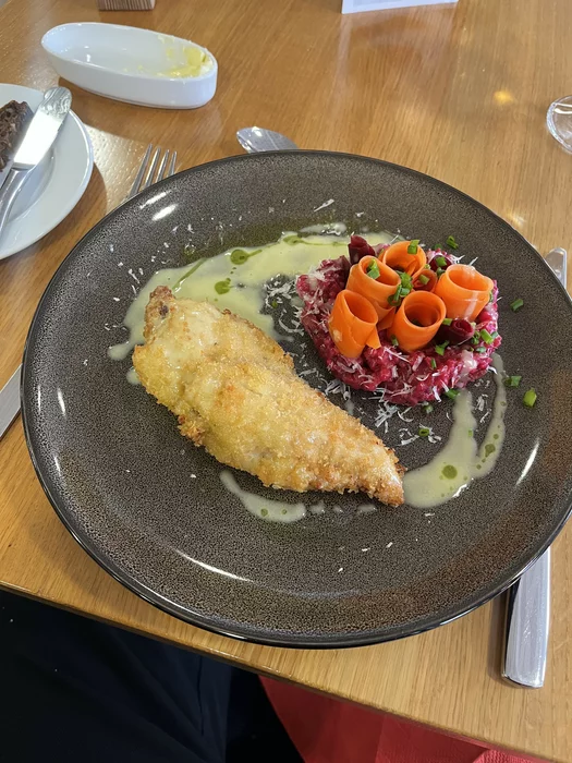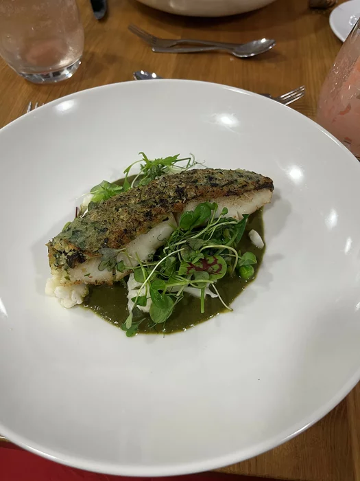 Закуска(хрустящее что-то), рыба(филе белой рыбы), десерт(мороженое).