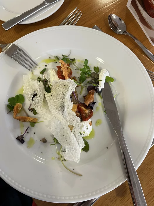 Баклажан с козьим сыром. (Сочетание баклажан и козий сыр - топ👍, ставлю твердую четверочку) и плюсик можно добавить за хрустящую чипсину.