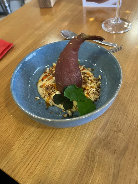 Томлённая груша в карамельно-облепиховом креме. (Пять балов, груша была мягкая и сочная, понравился еще карамельный крем, четко чувствовались кусочки орехов и немного для кислинки сверху спрыснули облепиховым сиропом)