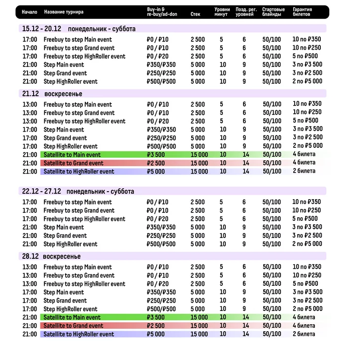 Воскресенья (21 и 28 декабря) — финальные сателлиты, в которых разыграем не менее 20 "проходок» в целевые турниры.