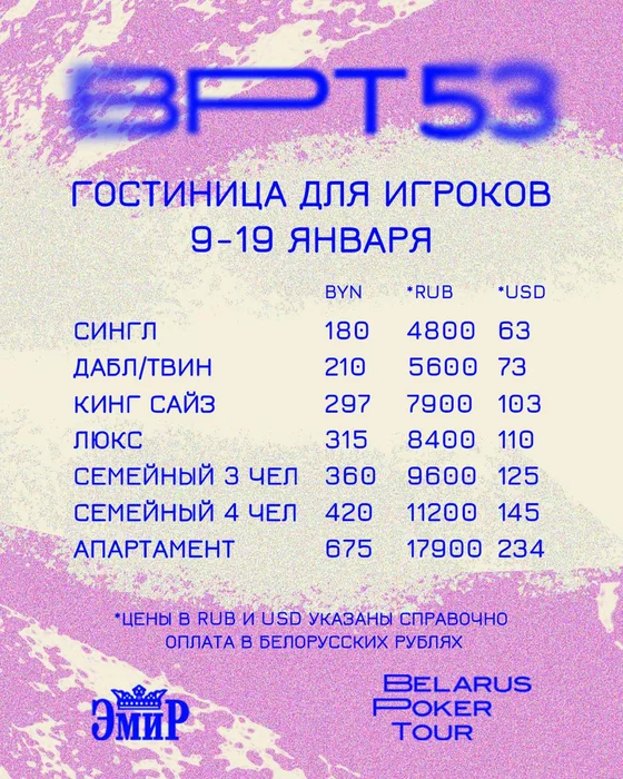 Цены действительны при бронировании через представителя Belarus Poker Tour. Цены в USD и RUB указаны справочно, оплата в белорусских рублях. Можно платить картой мир.