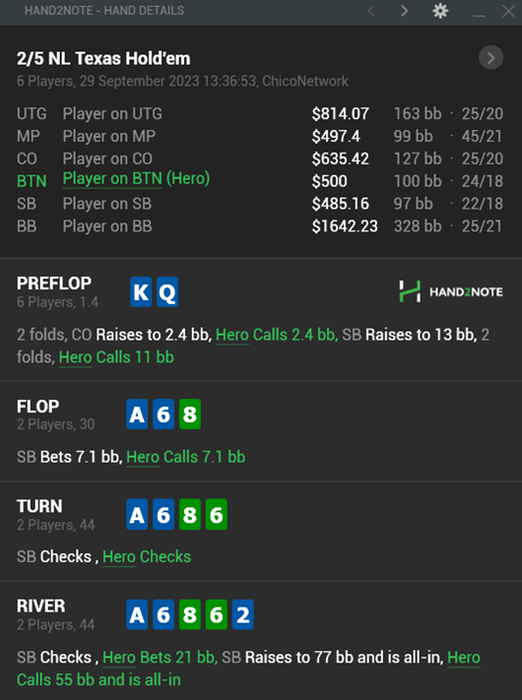 - В раздаче я сразу подметил на флопе необычный сайзинг и получив чек пуш на ривере, картина точно сложилась в голове, но я решил это проигнорировать, уговорив себя на колл.