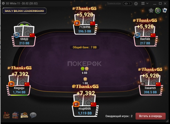 Суть такая: 6 китайских ботов садятся одновременно за стол ShortDeck 0,02 и в автоматическом режиме разгоняют банки, префлоп - все колл, флоп - мб ставит 75% и все колл, терн мб 75% все колл, ривер в зависимости от комбинации но обязательно вскрытие. По итогу в каждой раздаче 400 бб + и гарантированный стек 5к+ в турнир ThanksGG, в некоторых раздачах стек получают все 6 ботов. Играют как правило с 7:00 до 11:00 мск по 100-150 раздач и набивают стеки под 200к., что практически гарантирует попадание в призы.