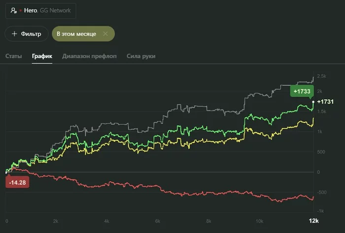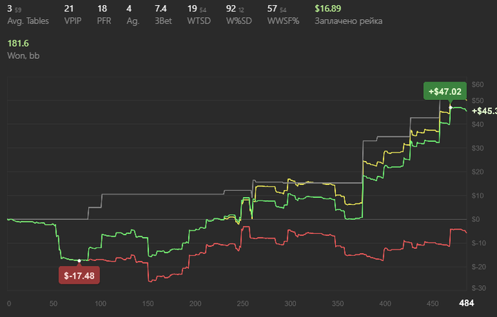 Половину месяца позади, промежуточные результаты радуют. Да тут переапнуло на 4би, но надеюсь и моя заслуга в этих цифрах имеется - лишнего не плачу опам и сам при каждой возможности пытаюсь добрать по максимум + держим красную за счет 3бетов, сквизов, а также чек рейзов и прочих инструментов.