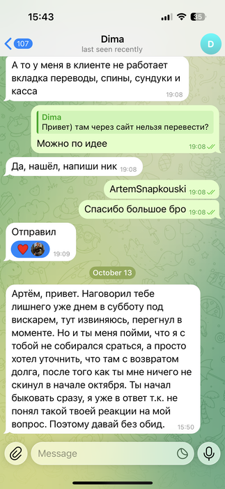 Я уже раздал 80% всах долгов, и тебе тоже верну, скинь свой кошелек. Ты мог по человечески написать мне, а не как ты это сделал, резко в моменте просто напасть, зная что это ев не добавит, учитывая мою ситуацию. Не уследил за бром, было дело, но зная, что я отдам создавать арбитраж из за просроченного долга это сильно