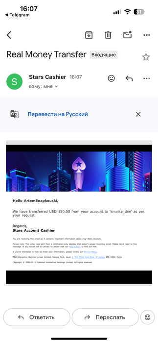 ArtemSnapkouski, проверил, деньги пришли на счёт. Финансовых претензий не имею.