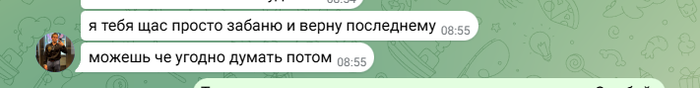 Вернул 36 минут назад, то что должен был отдать в августе? Мелкий писдюк так вести себя нельзя. Был с тобой в одной конфе, обычно был на твоей стороне, когда тебя жизни учили, ну видно что ничему не научили. Прикали за 200 баксов замараться в красном рейтинге и со статусом арбитраж 🤡