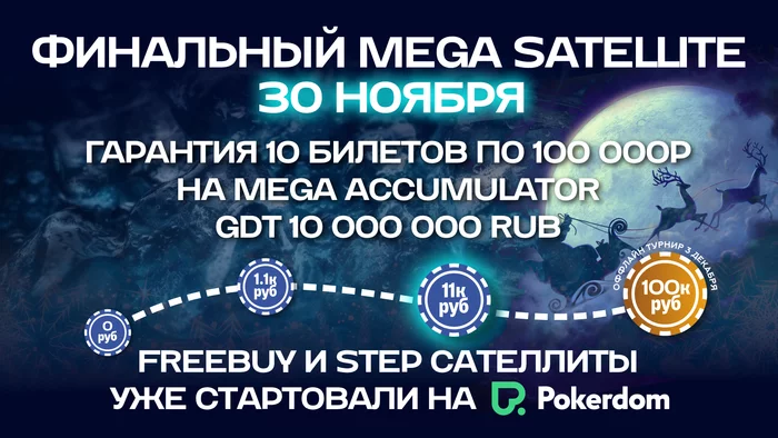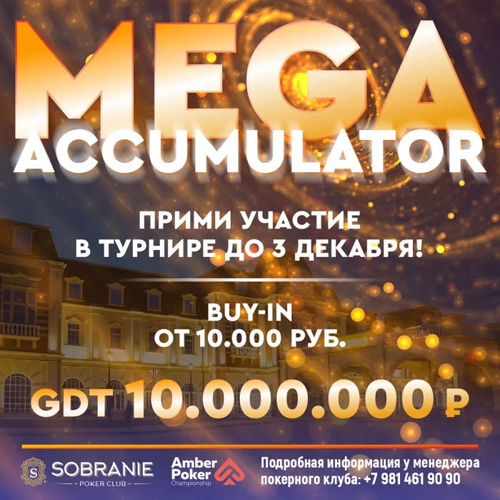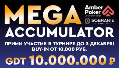 28 ноября в 22:00 МСК (21:00 по Калининграду) пройдет финальный сателлит к турниру Mega Accumulator Day 2 с гарантированным призовым фондом 10.000.000 рублей.