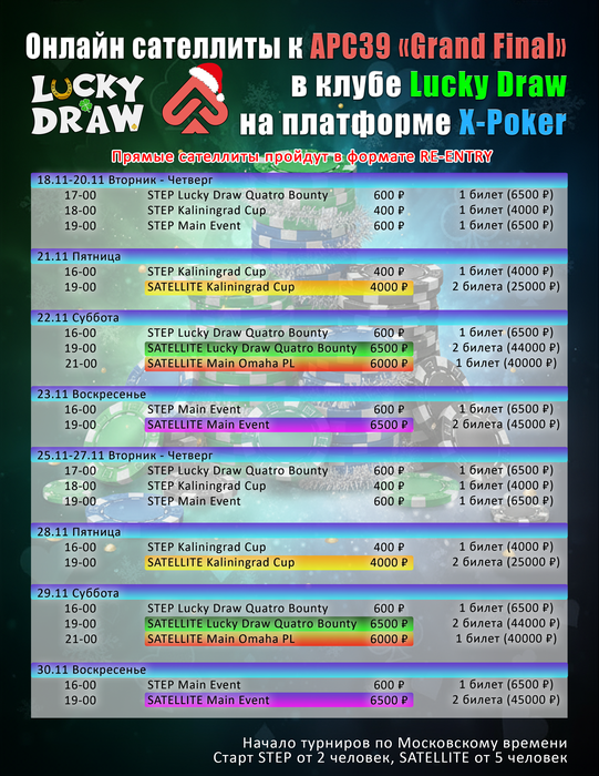 Напоминаем, что в мобильном X-Poker (клуб Lucky Draw) ежедневно с понедельника по пятницу в 21:00 МСК (20:00 по Калининграду) проходят степ сателлиты по 400р.