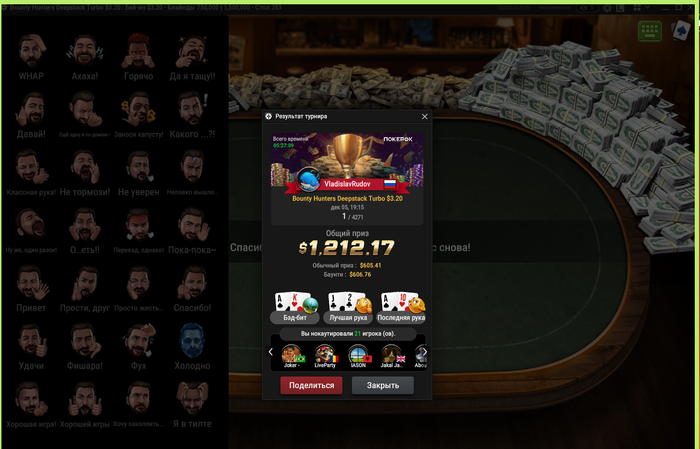 Главным событием стал, конечно же, выигранный фризаут за 2$. Турнир шел весьма живо: оппоненты активно играли, местами даже чрезмерно агрессивно, что давало пространство для манёвров, но одновременно требовало аккуратности и точных решений. По ходу турнира стек периодически проседал, потом снова рос — самые настоящие американские горки. Несколько раз пришлось принимать решения на границе, опираясь на динамику стола, тайминг и тенденции соперников. Но ближе к финалу игра встала на свои рельсы: удалось подловить нужные споты, сохранить фокус и выйти в хедз-ап с комфортным стеком.