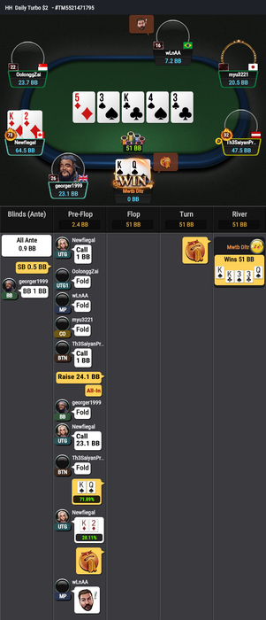Снизу ушатал четверых, потом раздал фишки так же глупо, как и набрал. Коллил все трибеты и 4-беты, что ему ставили.