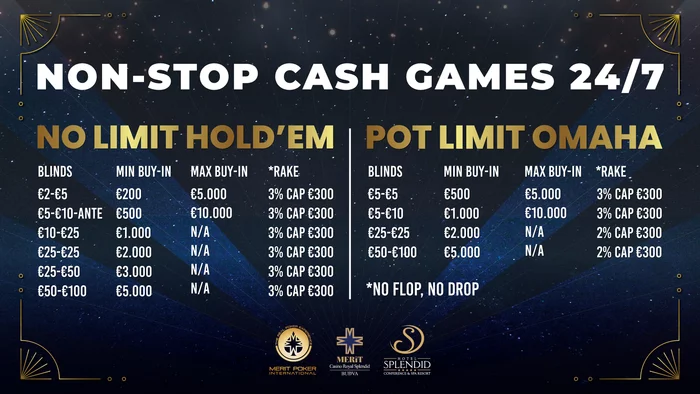 бай-инами в Main Event и Merit Poker Cup, начиная с 5€.