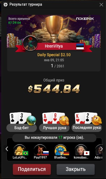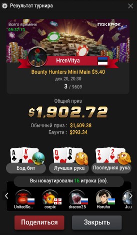 Я выбил 16 человек и выиграл практически все монетки. Складывалось нереально. Будто реально исход турнира был предрешен)) Снизу только на финалке переехал одно выставление, которое могло стоить мне 6-го места. АТ против AK. В остальном каких-то жутких переездов с моей стороны не вспомню.