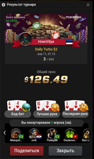 Проиграл флеш в фуллхаус. Мне казалось что очень плохо сыграл раздачу, сейчас посмотрел, вроде и не так плохо все. Этот оппонент когда я был коротышем активно меня атаковал, активно блефовал на ББ против меня, ставил увеличенный сайзинг и выбивал мой натсовый флеш дро K8s, показывая потом 52о. Когда остались втроем, он же и отгрузил мне фишек. Поэтому воспринимал его как переагра, который упустил момент, что я теперь не добыча, а хищник, я больше в меня блефы не сработают) Ну и на 11 час игры, что было моей самой долгой сессией за эти 3 недели, я конечно же уже устал, и хотелось здесь и сейчас идти уже в хедз ап. Ну и еще верил до последнего в сказку, что соберу ФЛЕШ-РОЯЛЬ под конец турнира и занесу 1 место))