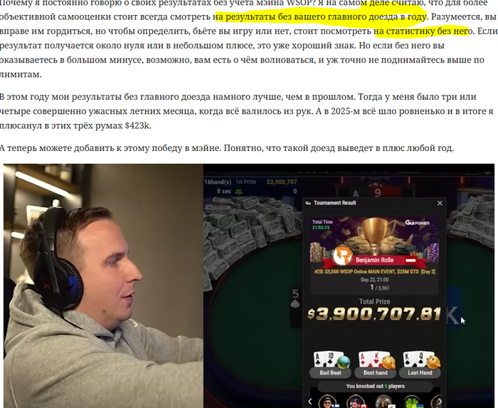 Я конечно переап, но все таки приложил усилия для роста скилла и качества игры)) Как думаете, заслужил заносик?) Ну и да, это мой БЕСТ КЭШ. До этого 1148 долларов было в 2022 году, когда из 10000 человек отобрался на 5 бесплатных билетов по 250$ на 888 и занял там 67 место из 2000 человек. И да, там я тоже хотел в начале просто хотя бы попасть в призы, а потом пересиживал пэйджампы. Вот такая вот не радующая закономерность.