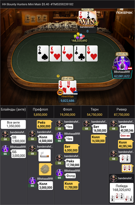 Ключевой стала раздача в середине турнира, где ЕП 20бб открылся, а я с МП+1 50бб с AJ решил заколлить, думал над 3бетом но зажался, чего-то испугался и произошло то что произошло. На флопе Jх42s, мы выставились и поехали. Я тогда погнобил себя, что зажался и не нашел в себе силы 3бетнуть, и решил что нужно показывать свой покер и не бояться играть. После этого я х10 баунтей наколотил)