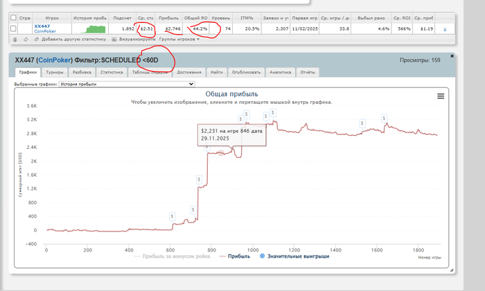 турниров - 531, ABI - 2,33$, ITM - 17%, ROI - 213,8% (Если посчитать рейкбек, бонусы и билеты - 217,4%)