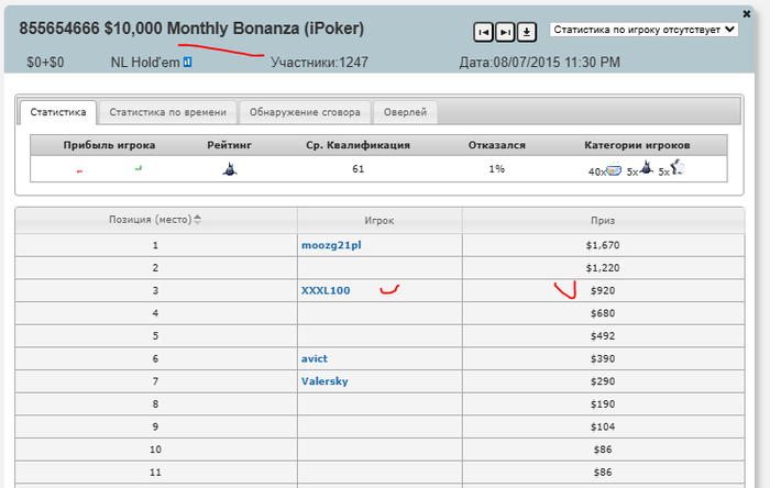 две Бонанзы Титан рум (сеть айпокер и их фрирол) за 5-6 лет по 920$ , оба 3-е месте. Это гипер. Как объяснить: а) гипер, б) раз в месяц и 12 раз в год, за 5-ть лет всего 60 турниров, не во всех участвовала, а точнее чуть-чуть участвовала и два 3-х...ПЕРЕАП