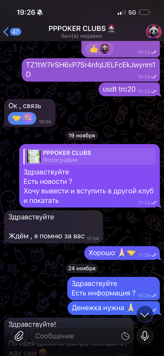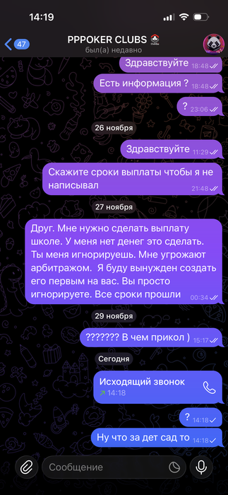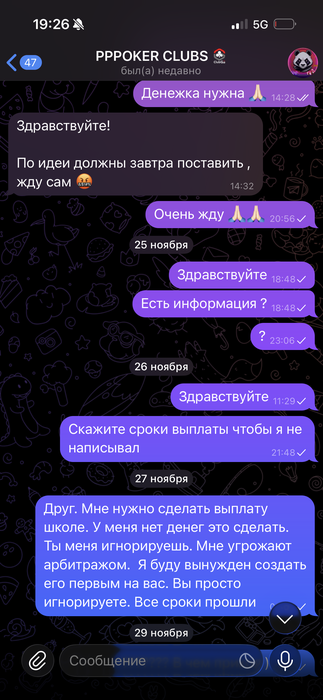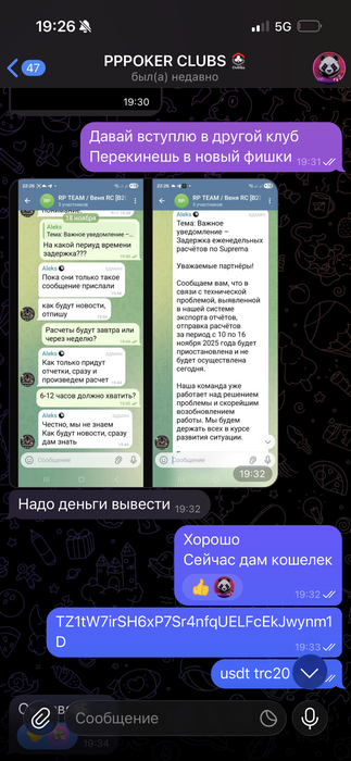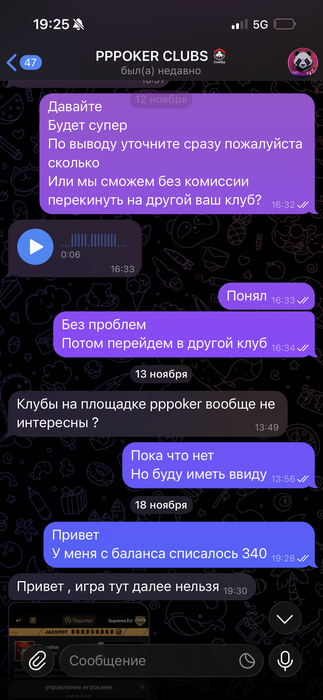 @pppoker_global_union вступли в клуб Suprema через этого агента . Меня сначало смутило что они берут комиссию 5% на пополнение аккаунта. Я пропустил это и начал катку. Захожу в один из дней покатать и вижу что у меня списано 340$. Я пишу сразу агенту и все дальше будет в переписке которую я заскринил. Хочу создать на этого агкета арбитраж и вернуть деньги . И всех игроков предупредить об этом агенте. Всем хорошего дня