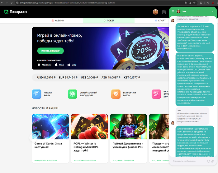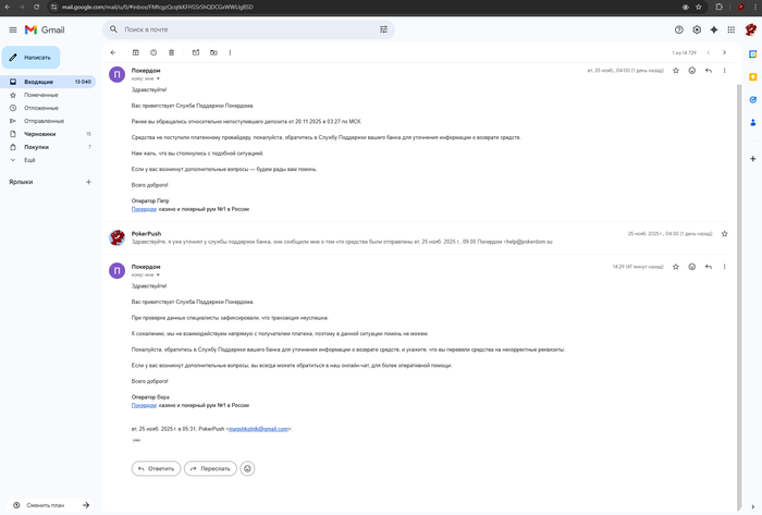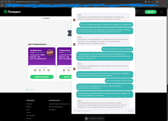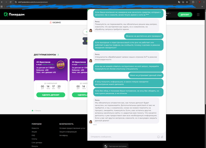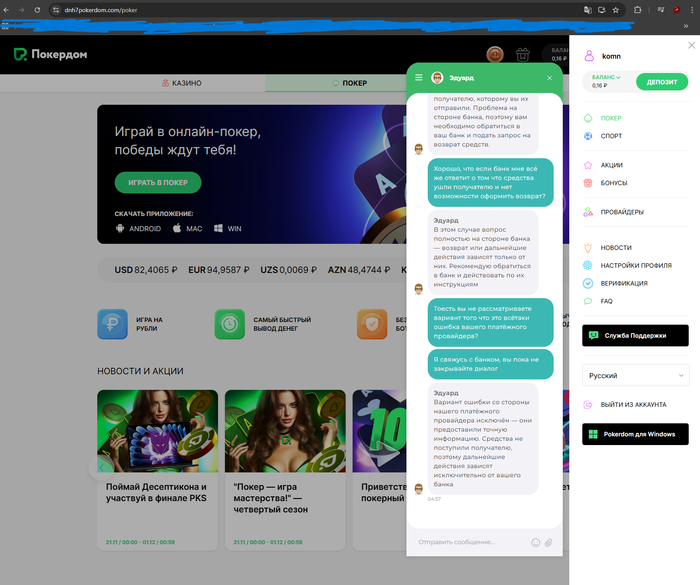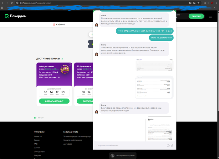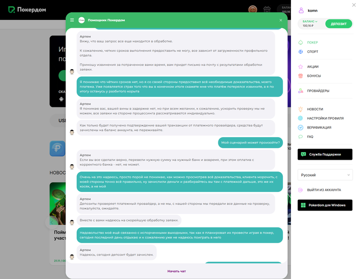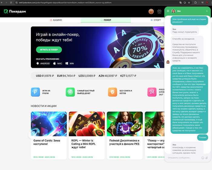 Кстати, пришёл к определённому мнению, читая ситуации других людей, которые столкнулись с данной проблемой, прежде чем перекладывать ответственность на игрока, Покердому нужно сделать одну важную вещь: на странице депозита методом карт или СБП писать, что в случае возникновения проблем с платежом (на стороне платёжного провайдера) ответственность полностью лежит на игроке. В таком случае люди просто не будут использовать этот метод и питать надеждами, что техподдержка им потом поможет. Звучит глупо, но правдиво, прочитай я такое объявление, я бы сто раз подумал, прежде чем делать депозит
