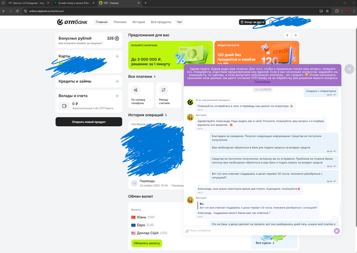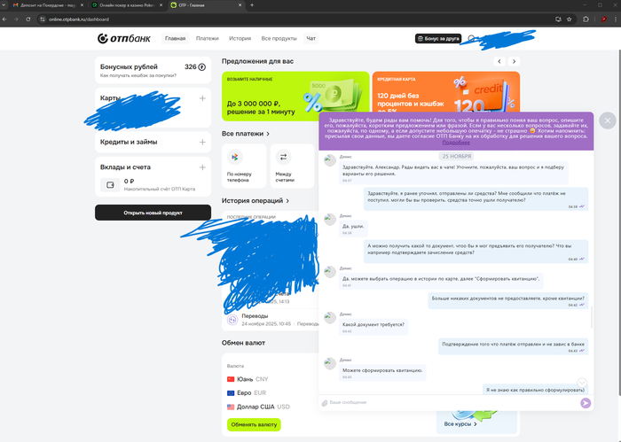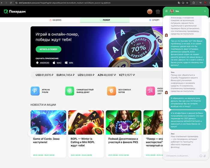 После долгой переписки с поддержкой Покердома я также решил позвонить и уточнить информацию в банк получателя и на горячую линию СБП, чтобы уточнить, мог ли мой платёж зависнуть в системе банка, дозвонился до Альфа-Банка, рассказал ситуацию, на что оператор мне дал чёткий ответ, что если денежные средства переводятся по СБП, то зависнуть они не могут, так как средства зачисляются моментально, и, возможно, получатель меня обманывает, я это также осветил техподдержке Покердома, как работает поддержка и финансовый отдел в этой организации — это просто ужас, с моей стороны всё сделано правильно, мой банк и банк получателя сообщили о том, что с платежом всё в порядке, реквизиты и банк при депозите совпадают.