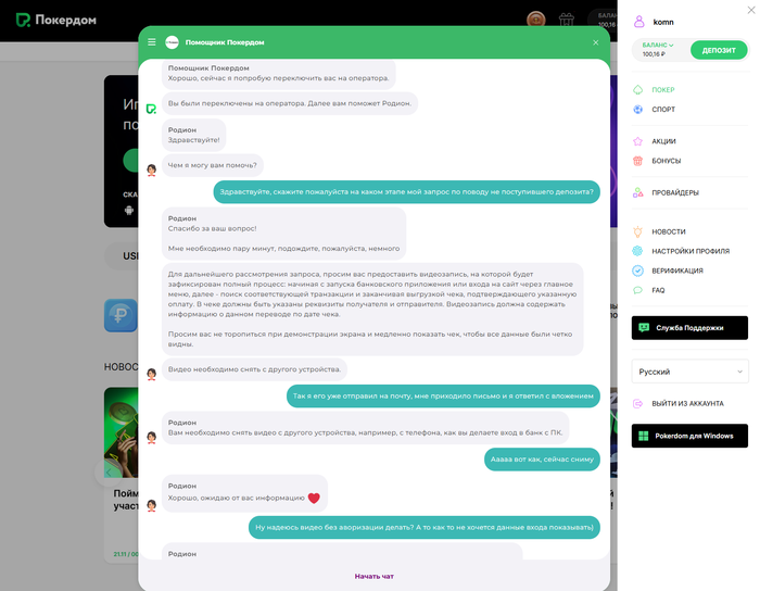 Средства на аккаунт зачислены не были, и я, как и положено, обратился в техподдержку, они запросили у меня сначала выписку и чек в PDF, я скинул. Потом попросили записать видео, как я захожу в личный кабинет, я скинул.