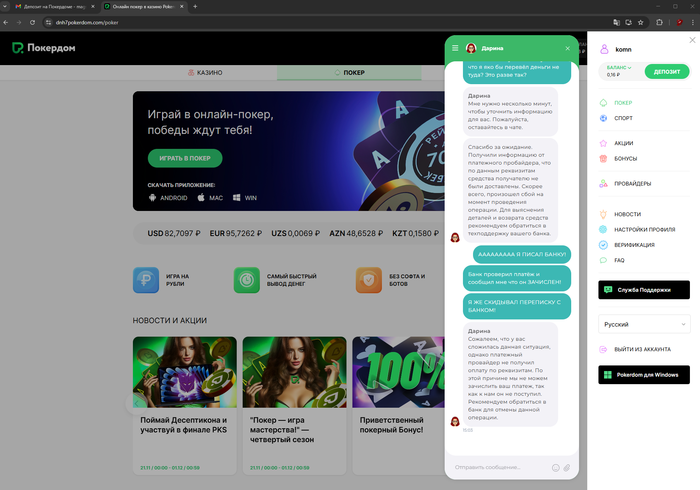 Но я уверен на 100%, что если бы я перевёл деньги в корректный банк, и деньги бы всё равно не поступили, потому что дропер решил кинуть меня и рум - то Покерок бы полностью возместил этот депозит за свой счёт, а не писал бы: "Бля, этот дропер кинув тебя - кинул нас, и мы с этим ничего не можем поделать и не будем тебе ничего возмещать."