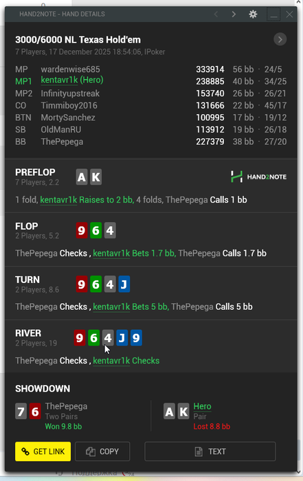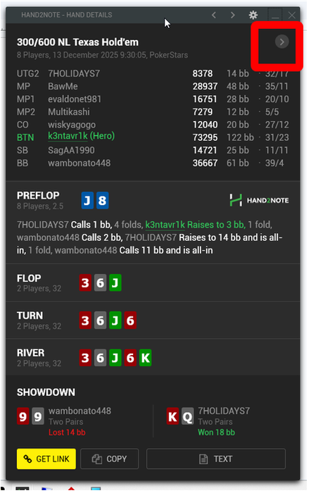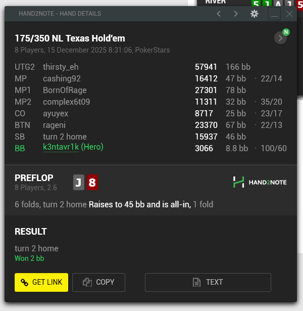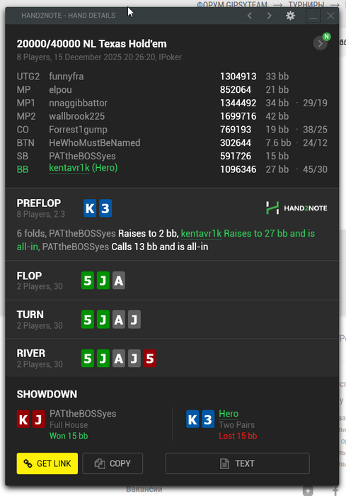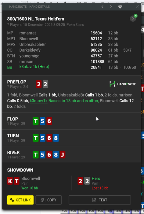 Если мне кто подскажет, как по Hand ID найти текущей состояние турнира (важна информация Hand ID = Player left) - буду очень благодарен. Пока приходится искать приблизительно, по стратегии "пробей турнир на шаркскопе - поищи, кто из стола закончил самым последним, и прикинь, сколько еще до ИТМ", а разница в рассчетах между прямым баблом и 4 до ИТМ может быть колосальной