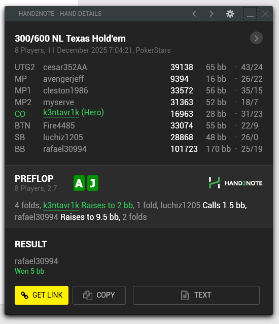 Бабл, открывается ЕП ~17bb, я на СО с АА чуть больше стек, не помню был ли ББ в раздаче. Какой-то сухой борд, он ставит около 40%, я просто колл. По терну туз, он ставит тоже около 40%, я колл. И тут старзы лагают, но, судя по тому, что бабл я пережил и фишек стало чуть больше, какой-то ривер он чек, и я ситаутом тоже чек. Не добрал, получается;)