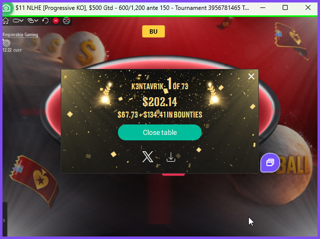 Запустил вчера фрилольчик на ГГ, и почти обошёл 12к участников. В Топ 16 уже, вспомнив вчерашнюю тренировку и получив топ1 стек (ср стек 9бб, мой 31) (но там речи про МБ была и если есть топ нок, так что "услышал звон - не знаю, где он") и сыграл оч диспово (впушил 33 с ЕП+1) и получил колл от 4 стека с АКс. Оставшись с огрызком пережил ещё 1 PJ и занял 12/12.000. Хотя грёзы о первом 4ех знаке, пусть и в кэш долларах, уже были.
