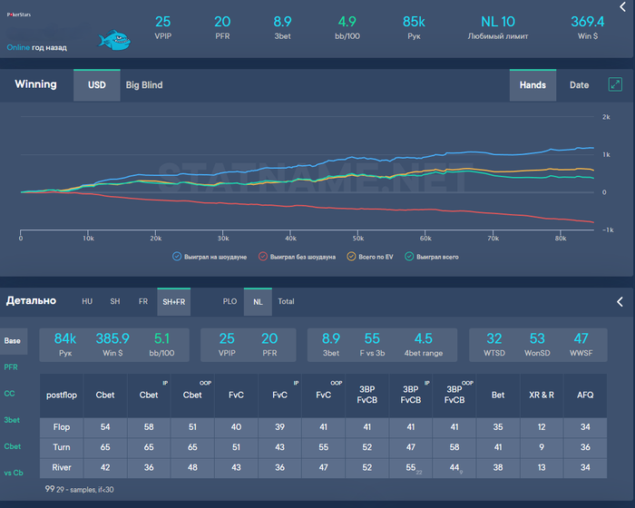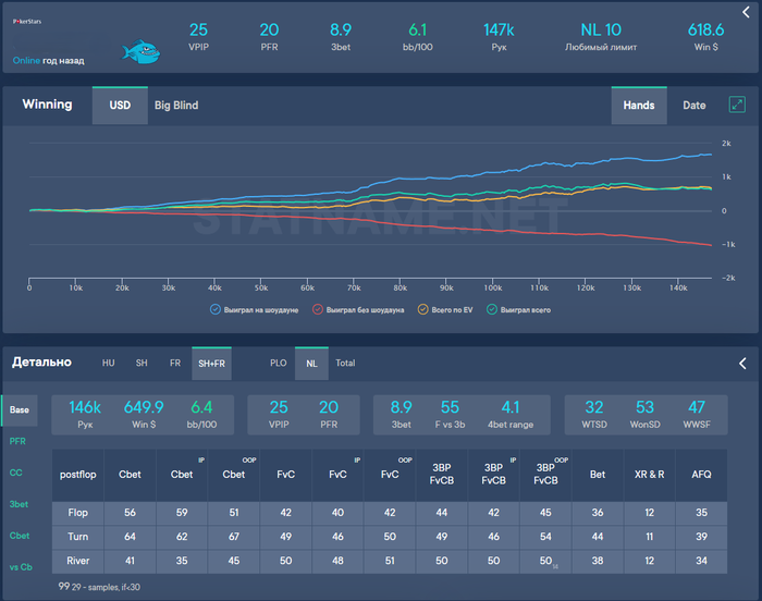 С покером знаком с августа 2020 года играл все что игралось, с 2021 года переключился на кеш 6 макс играл патипокер (пока не ушли из РБ поднимался до нл 10), затем был GG ну и где-то с середины 2023 года по 19 февраля 2024 года катал на PS, где также поднимался по лимитам с нл2 до нл10, потом в моей скромной жизни случилось чп попал в больничку на месяц (перед лицом произошёл взрыв, сильно пострадали глаза но благодаря стараниям наших врачей зрение удалось восстановить, с последствиями травмы приходится бороться и по сей день) после того как выписался, пытался вернуться обратно в покер но безуспешно, поэтому решил взять паузу от покера и 2025 год не играл вообще. Графики которые удалось восстановить прикреплю за все время игры на PS, к сожалению рук наиграно мало тк играл после работы, а на работе много командировок()))