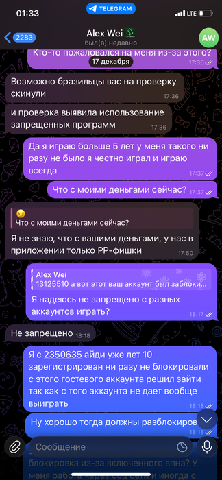 Я что только было возможно предоставлял, и пытался разобраться-предоставить информацию или нужные документы-предоставить доступ к устройству дистанционно, обьяснял что играл с гостевого аккаунта без использования ботов, читов, просил проверить в ручную психологию поведения за игрой, столы , и сам баланс - сравнить со старым UID которому 8 лет и не однократно удачно проходил проверку ничего за это время у меня не менялось и не скрывалось от них, устройство одно и тоже. В ютубе есть видео где играют с помощью подобных софтов через ИИ но там требуется пк и вход в аккаунт , но при гостевом аккаунте нельзя пройти верификацию и сделать логин с паролем, хотели однажды купить мой аккаунт с большим количество раздач для этой цели и осведомлен что для этого нужны старые аккаунты с большим количеством раздач.
