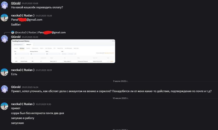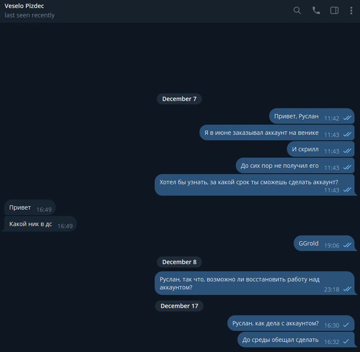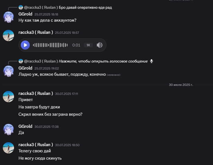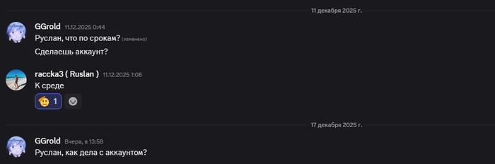 На протяжении месяца Руслан переносил сроки, просил подождать, говорил, что берёт аккаунт в работу и пропадал. Жаловался на тяжёлые жизненные обстоятельства, которые не могут позволить начать работу.