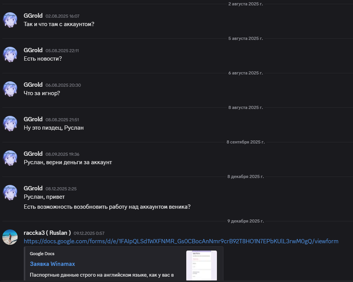 Если честно, я этот арбитраж пишу от отчаяния, у меня нет никаких других идей, как можно было бы повысить шансы на то, что я получу аккаунт или хотя бы возврат средств за него. Я боюсь представить, скольких людей Руслан кинул точно так же, как и меня! Надеюсь, если справедливость после этого арбитража и не будет восстановлена, к нему хотя бы обратиться меньше людей, чем могло бы